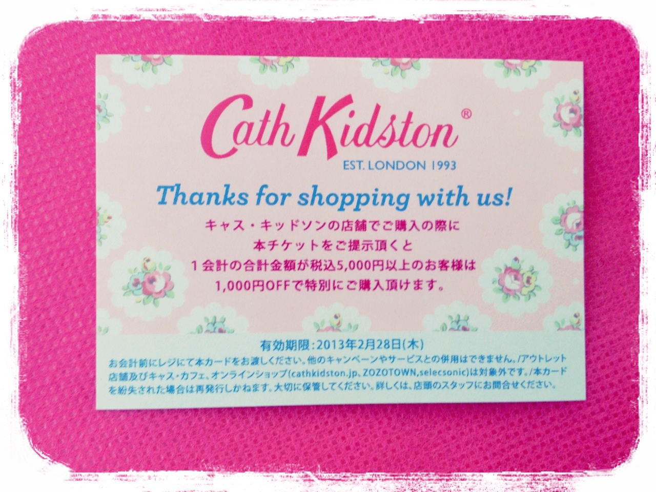 キャス・キッドソン(Cath Kidston)の店舗で5,000円以上購入すると1,000円オフになる素敵なカード。