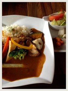 グリルされた大きな野菜はほんのりガーリックがきいていて、野菜がひとつひとつ甘くておいしかったよ。辛くないカレーだから辛いのが苦手な人でも食べられるよ。