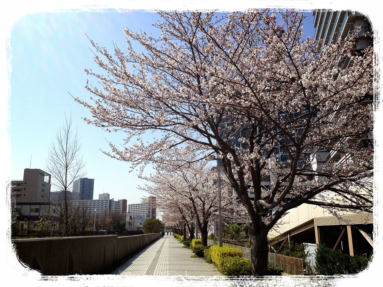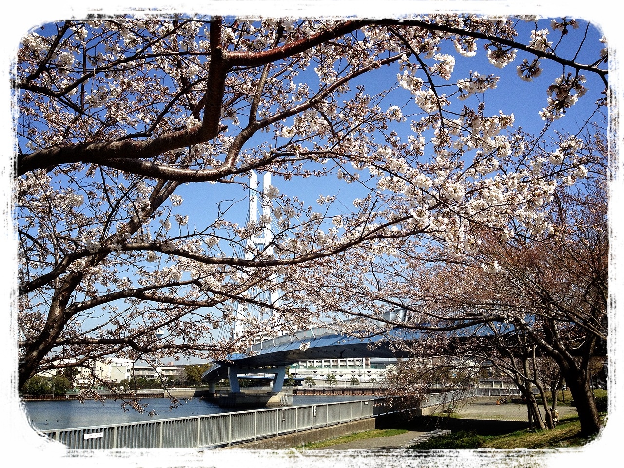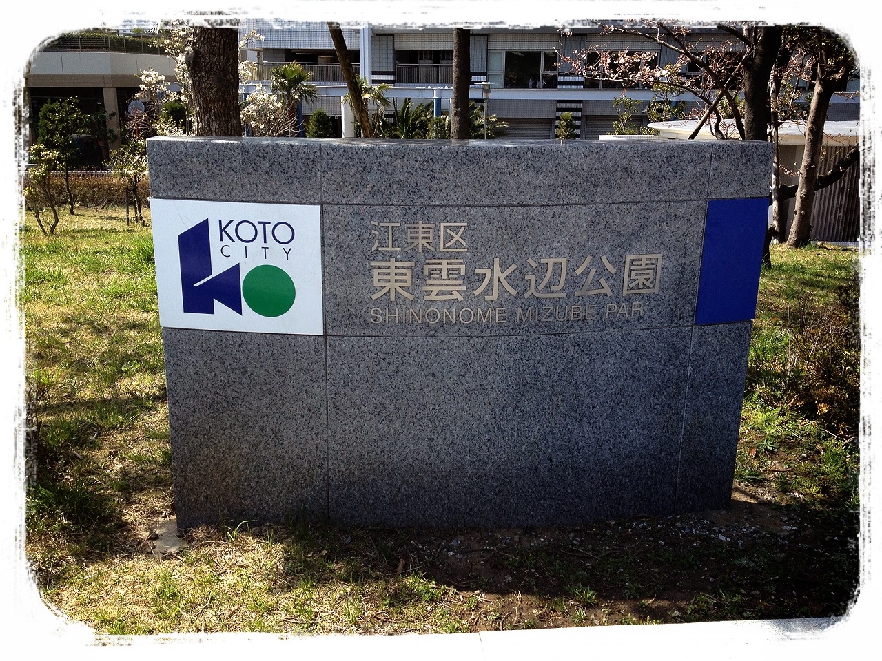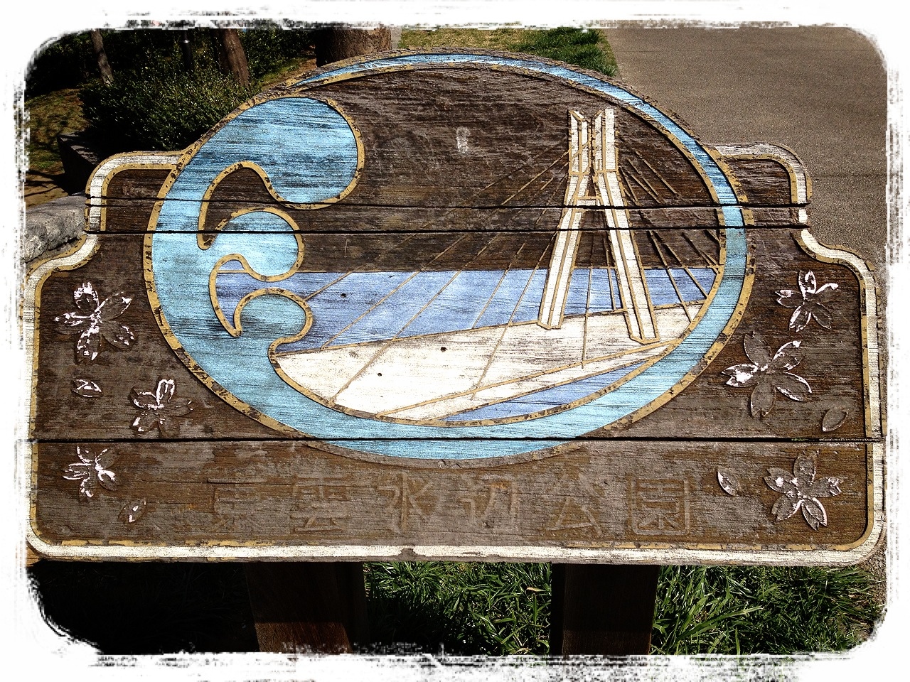 そうそう、東雲水辺公園の看板って2つあるんですよ。2つ目の看板はコレです。よーく見ると桜が描かれています。