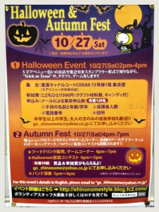毎年恒例らしくって去年、偶然S字アベニューで仮装したちびっ子たちを目撃したよ。「TRICK OR TREAT! TRICK OR TREAT!」って言ってて、かわいかったからよく覚えてる!そのでそれはこのハロウィン&オータムフェスのイベントだったんだね。