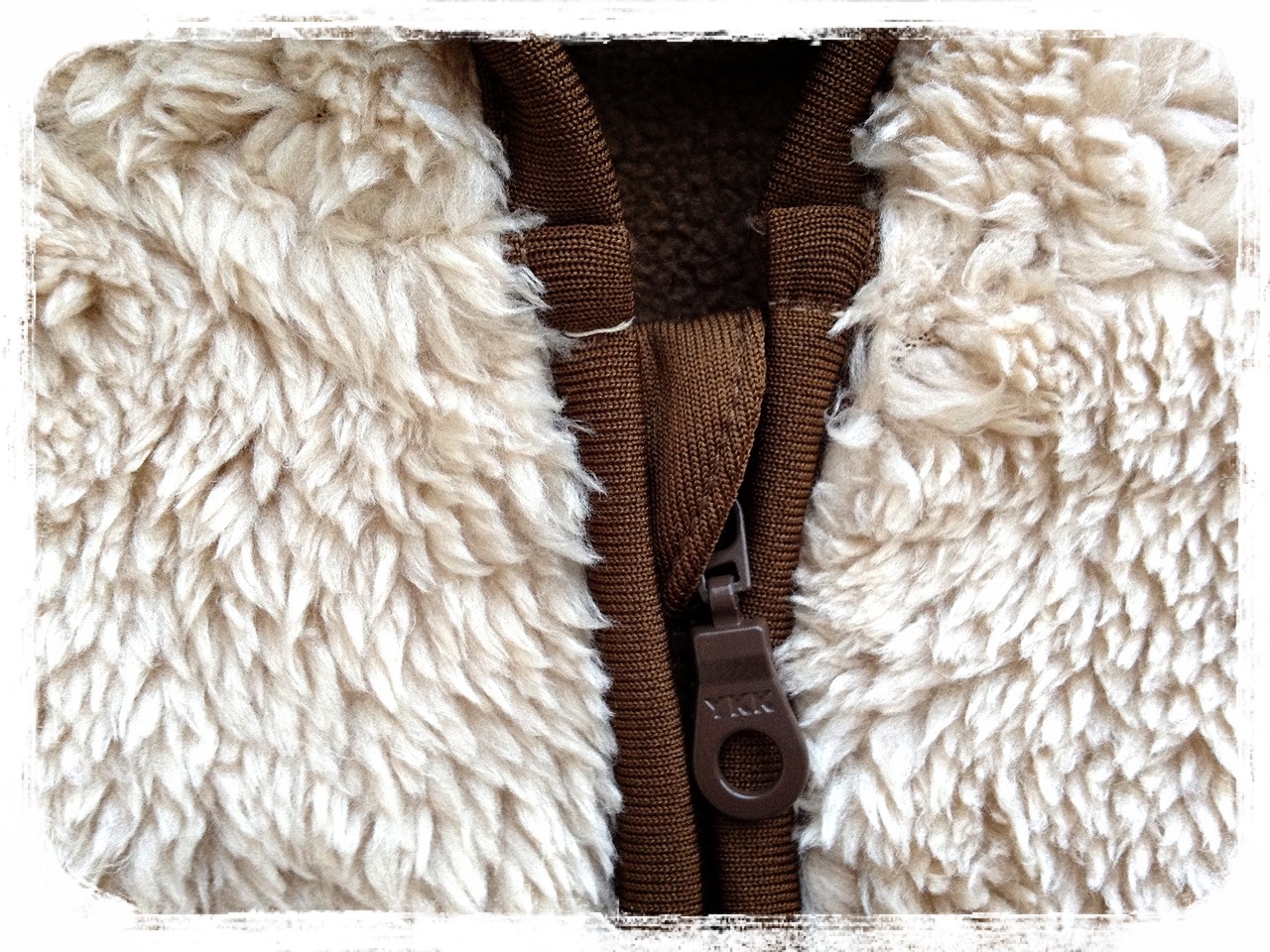 ベージュを選んで正解だったよ。ぬいぐるみの様な質感が強調されてかわいい!チャックの上にカバーが出来るようになってるよ。こうなっているとチャックを直接なめなくていいかも。内側にはやっぱり名前を書くタグが付いてたよ。