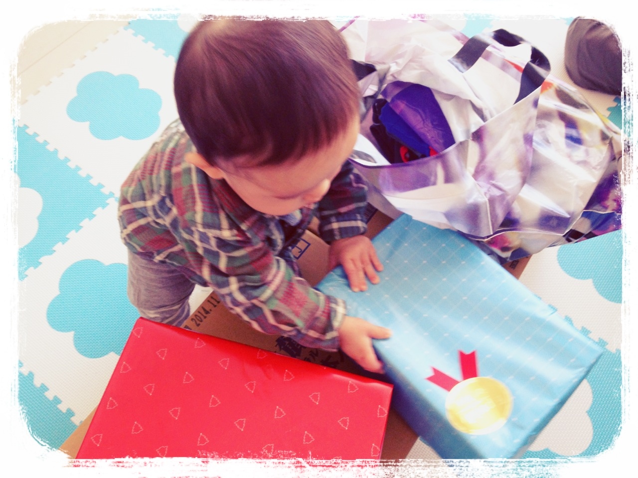 この後、自分で包みをビリビリ。すごいねーって皆で褒めたら何故か号泣しちゃいました。